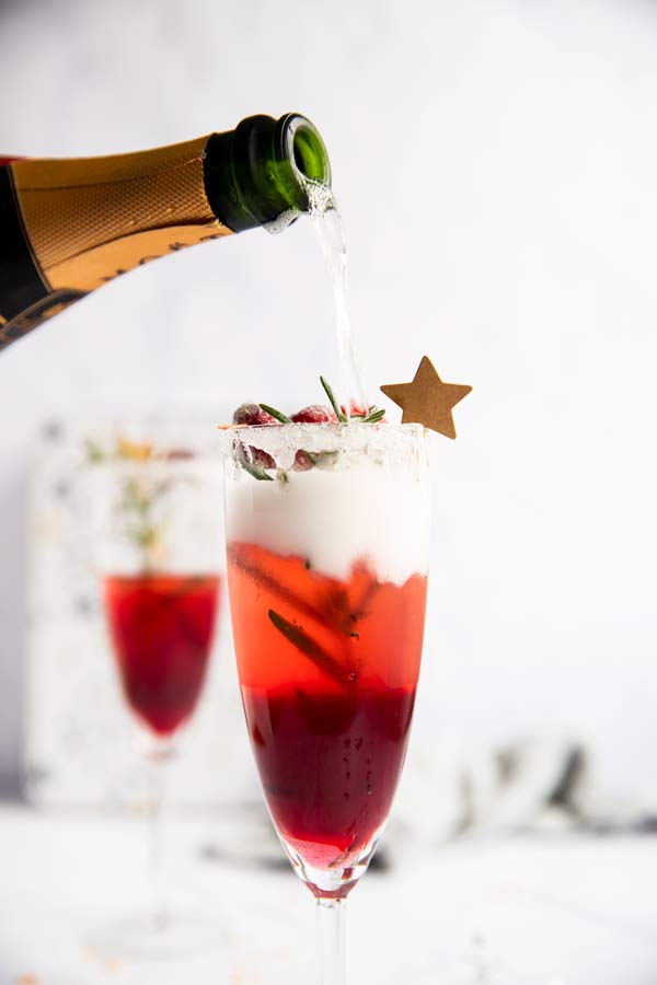 Agregue el jugo de arándano y vierta el champán sobre él. Adorne con romero (y arándanos endulzados si lo desea) y sirva de inmediato.