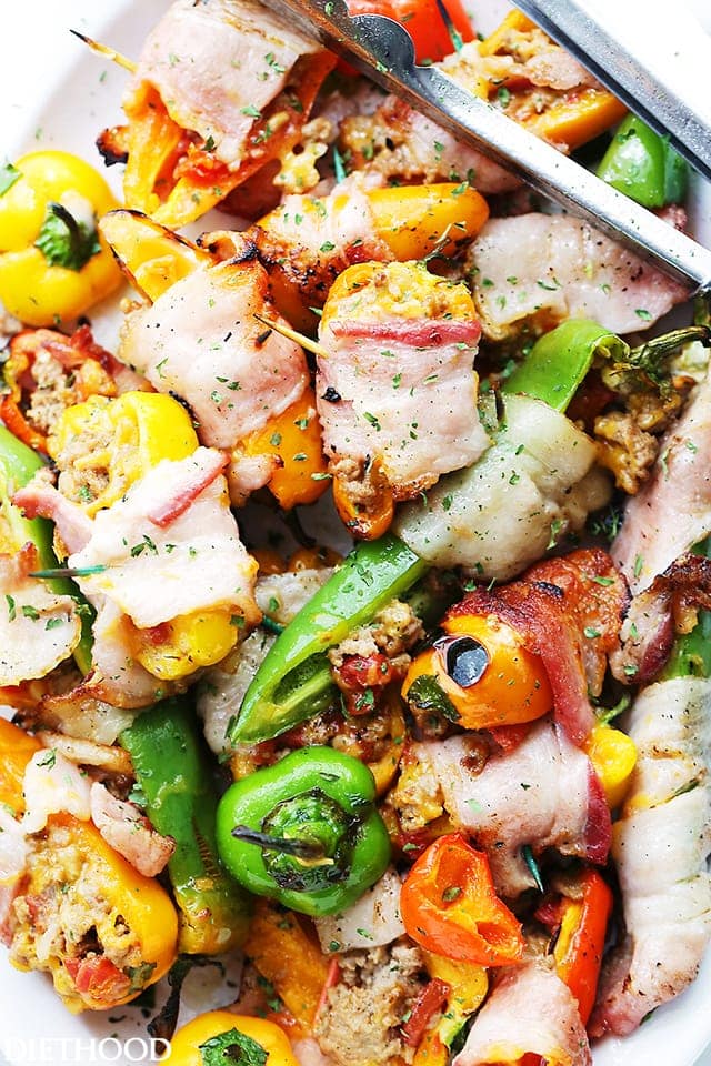 Mini pimientos asados envueltos en tocino – ¡Delicioso tocino envuelto en sabrosos mini pimientos rellenos con una sabrosa mezcla de pavo a la parrilla y tomates molidos!