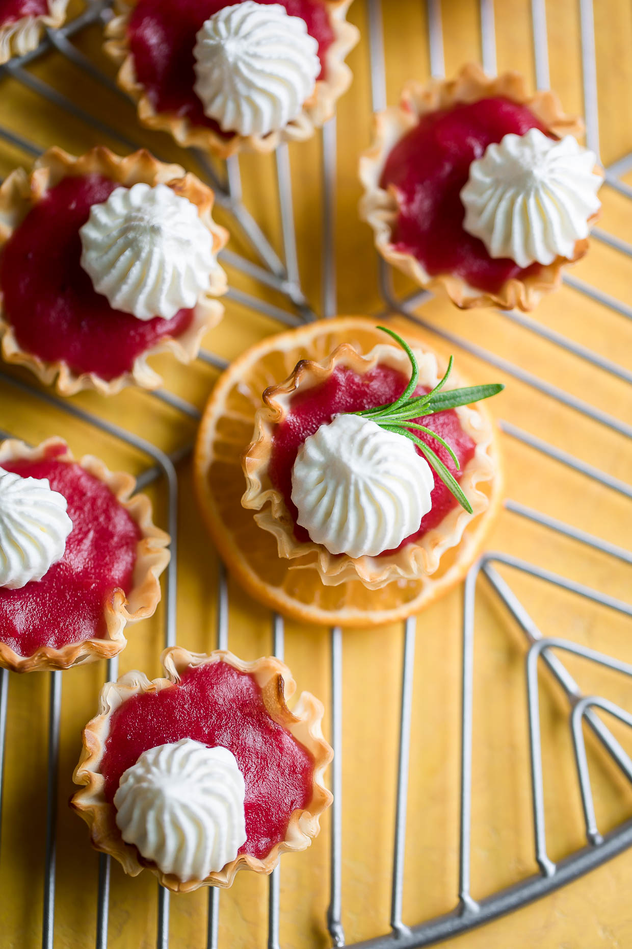 ¡Toma un paquete de tazas de hojaldre y haz estas tartas de arándanos para las fiestas! Este sencillo postre presenta una sabrosa cuajada de arándanos y naranja hecha con un remolino de crema batida.