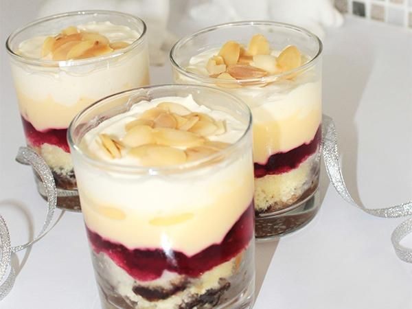 La cuchara casi coloca la gelatina encima de cada bizcocho y encima con una capa de nata y luego de nata. Mantener refrigerado hasta el momento de servir. Decorar con láminas de almendra.