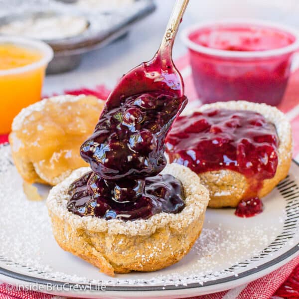 Disfruta de un desayuno fácil estas vacaciones con estos divertidos Mini Puff Pancakes. Agregue algunas cucharadas de Lucky Leaf Toppers en el centro de cada uno y observe a sus invitados cavar.