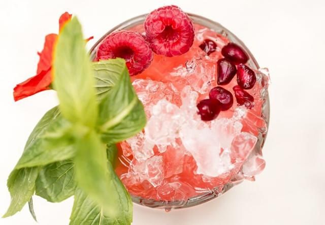 Vierta en un vaso de su elección con hielo, luego agregue soda y decore con menta y flores comestibles.
