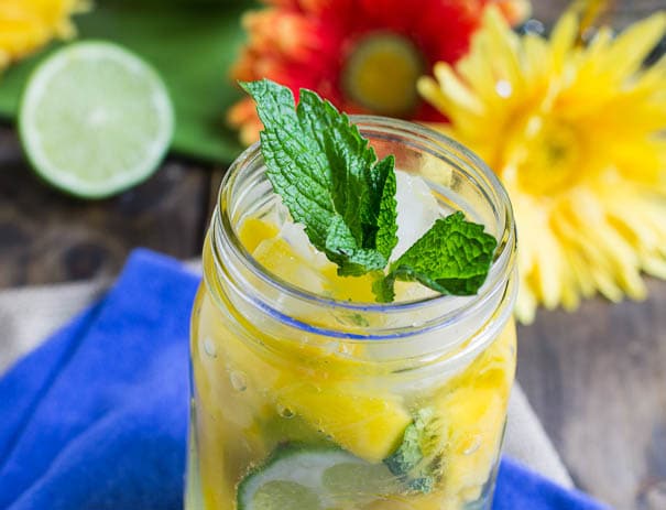 Mango fangoso y hojas de menta fresca mezcladas con ron blanco, ron de mango, jarabe simple y agua carbonatada. Es un cóctel dulce y delicioso para ayudar a combatir el calor del verano.