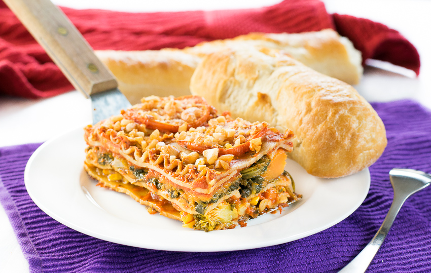 Afortunadamente, esta lasaña de vegetales saludables Engine 2 está repleta de vegetales saludables, camote cremoso y trozos crujientes de anacardos triturados; ¡Ni siquiera me importa si es saludable para mí!