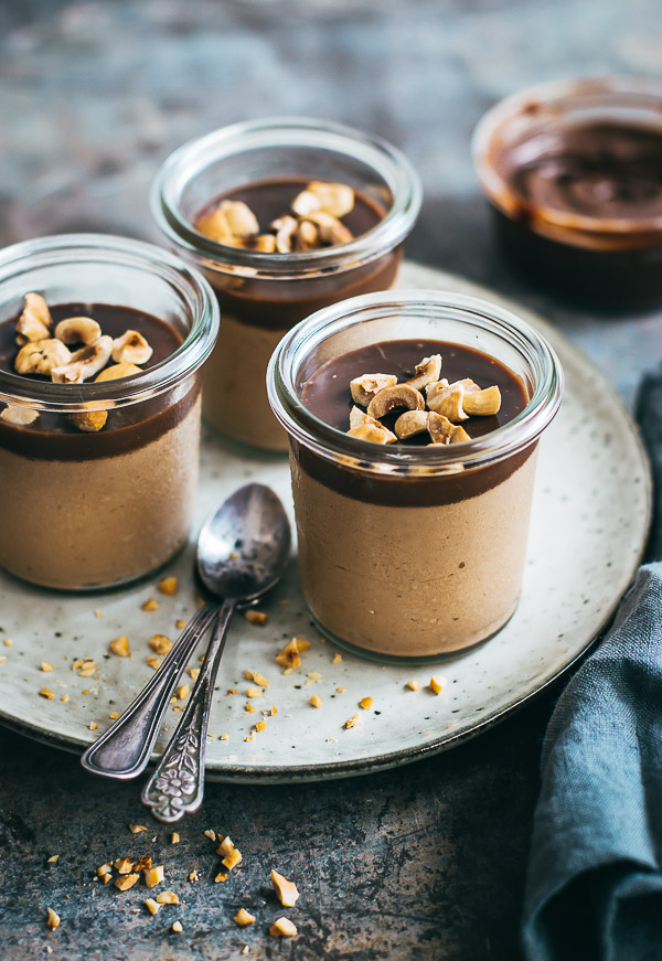 Mousse fácil de chocolate con leche con crocante de avellanas y ganache de chocolate y avellanas. No creerás lo buena que está esta mousse de chocolate y avellanas. ¡No pude cuando lo probé por primera vez! He hecho la base de mousse de chocolate un billón de veces, pero con solo agregarle avellanas picadas la hace diez veces mejor. Mousse Esta mousse no lleva huevo y es muy fácil de preparar. Es maravillosamente esponjoso con una textura similar a una nube y se pone un poco crujiente por las avellanas. Gracias al chocolate con leche, es incluso más dulce que mi mousse de chocolate negro. Avellanas Prefiero usar avellanas picadas finamente, más algunas avellanas picadas gruesas para decorar. Si quieres que queden menos crujientes, puedes usar avellanas molidas, o para una consistencia más picada, úsalas picadas en trozos grandes. Las avellanas tostadas son preferibles porque tienen un sabor mejor y más profundo. Para tostarlas, mételas en el horno precalentado a 180°C y hornea de 5 a 8 minutos. Tenga mucho cuidado ya que pueden quemarse rápidamente. Ganache Mousse es excelente solo si quieres hacerlo tú mismo, pero la capa de ganache lo hace increíble. Es perfectamente suave y cremoso y obtiene su delicioso sabor a nuez de la crema de avellanas.