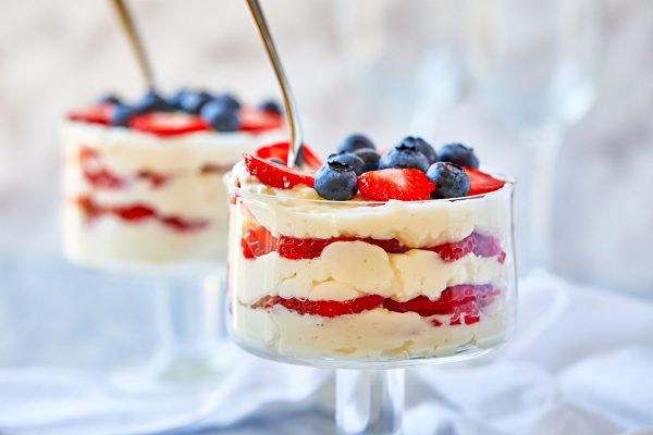 Mousse de tarta de queso con fresas – Suave y cremosa, cubierta con deliciosas fresas frescas y arándanos, estas postre de mousse de tarta de queso y fresas son el final final de una cena del 4 de julio! El manjar comienza con un cremoso relleno de queso crema y crema batida, cubierto con suculentas rodajas de fresa y cubierto con fruta fresca para darle un estilo patriótico. Para aquellos que siguen una dieta cetogénica, este mousse de fresa de hecho, puede considerarse una “bomba de grasa” ya que utiliza queso crema y nata montada como ingredientes principales. ¡Gustar!
