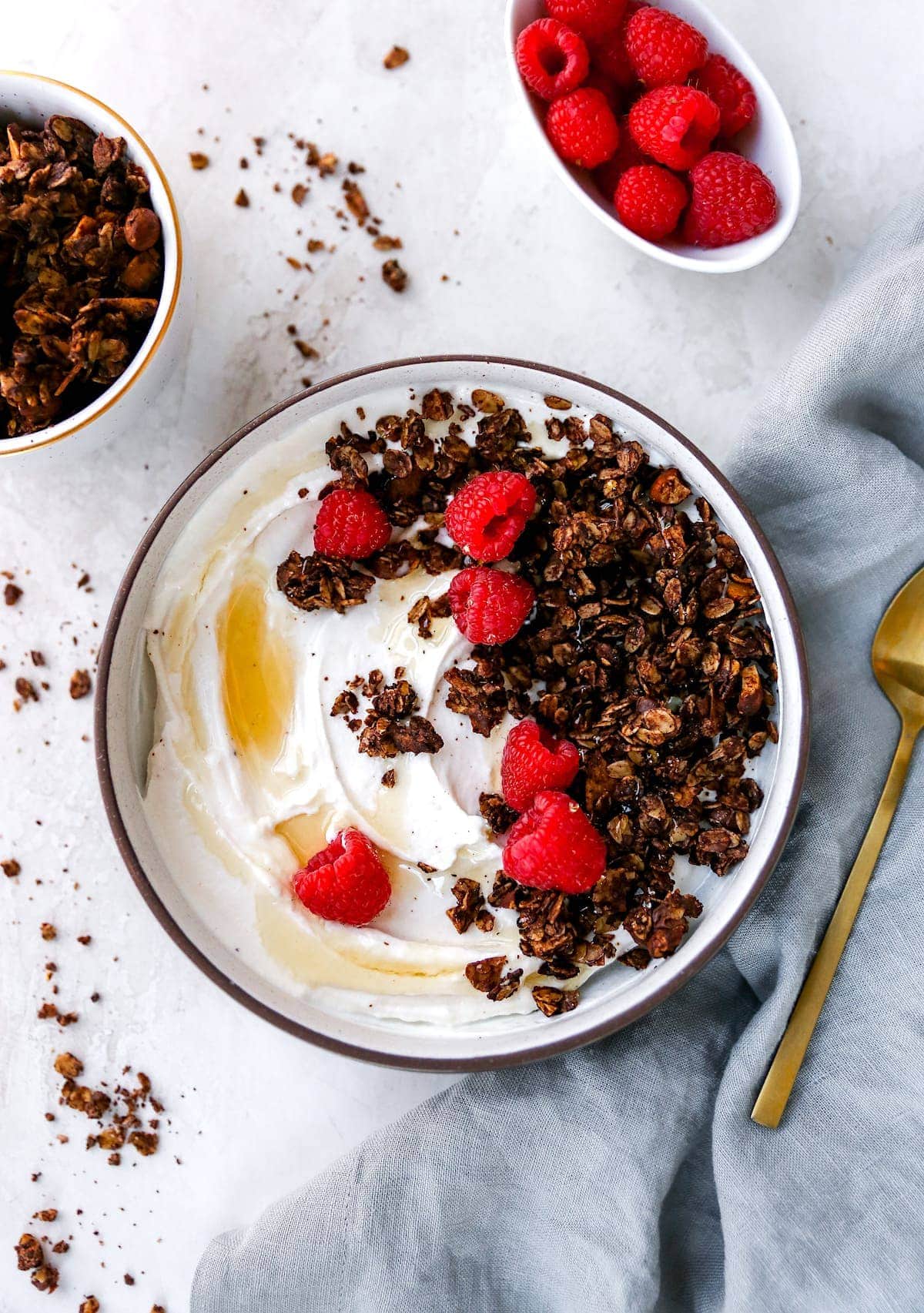 Muchas personas piensan en café instantáneo cuando escuchan espresso en polvo, ¡pero esto es diferente! El café expreso en polvo son cristales de café muy oscuros y finamente molidos que se disuelven rápidamente. Ni siquiera es para beber; ¡Los panaderos a menudo usan polvo de espresso para obtener un agradable sabor a moca o espresso! Búscalo en el pasillo de café o pastelería de tu supermercado o pídelo en línea aquí. ¡Realmente resalta el sabor del chocolate en esta granola y también en mis brownies favoritos!