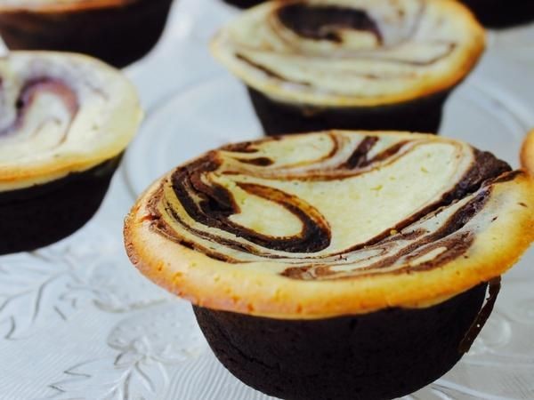 Divide la mezcla de brownie de chocolate en los 12 agujeros para muffins. Coloque la mezcla de tarta de queso encima y use un pincho para revolver la mezcla en cada molde para muffins para mostrarlos.