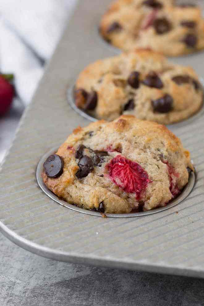 ¡Es por eso que los muffins de chocolate y fresa son geniales! ¡Gracias y! Hago su receta un poco más saludable usando harina de trigo integral y yogur griego, y sí, un poco menos de chocolate y azúcar. Mira cómo estos muffins desaparecen casi antes de sacarlos del horno.
