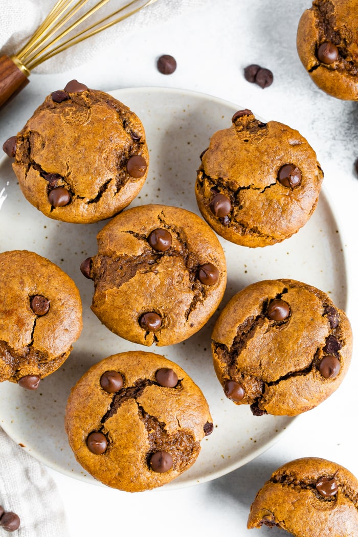 La parte emocionante de estos cupcakes no es lo que hay en ellos, ¡no es lo que hay en ellos! No hay harina (ni siquiera harina de coco o de almendras), ni aceite, ni mantequilla, ni lácteos, y contienen solo una pequeña cantidad de azúcar añadida de miel y chispas de chocolate. Nunca he horneado muffins sin harina, así que me sorprendió que se vieran y supieran como muffins de verdad, no como hamburguesas de calabaza y mantequilla de almendras. De acuerdo, me habría comido las bolas de todos modos, porque también se ven muy bien. hmmm… tal vez tengo otra idea de receta a mano. ?