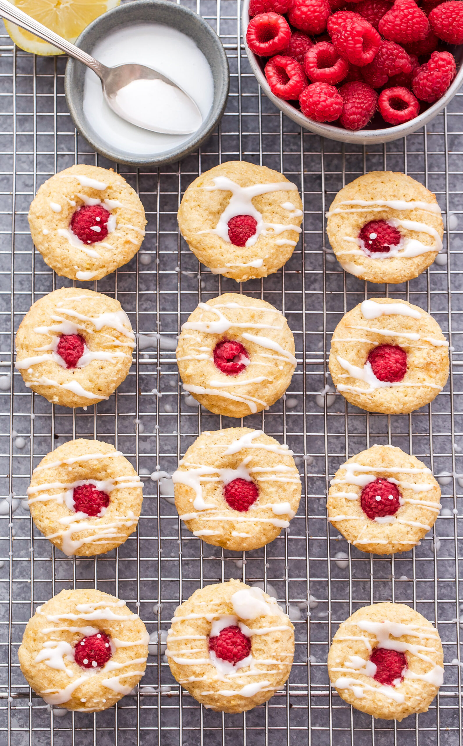 Estos muffins de frambuesa glaseados con limón saben a ralladura y jugo de limón, junto con vainilla y una pizca de extracto de almendras. Una vez que la masa está lista y dividida en los moldes para mini muffins, se presiona suavemente una frambuesa fresca en el centro de cada uno. Dado que las frambuesas son tan delicadas y tienden a agrietarse cuando se mezclan con la masa, pensé que esta sería una forma más limpia y fácil de incorporarlas.