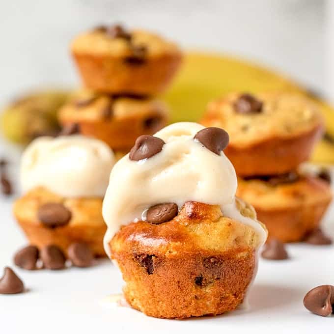 Los niños los llevaron a la escuela (menos el helado, por supuesto) y disfruté estos mini muffins de proteína de mantequilla de maní y plátano como un pequeño refrigerio, ¡evitando que bombardeara a mi objetivo con un enorme paquete de galletas!