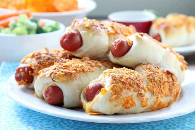 Pigs in a Blanket es una de esas cenas infantiles clásicas para todos, así que tomamos ese concepto y creamos estos nachos crujientes. En el interior está el queso pegajoso con el hot dog y las tortillas de nacho crujientes en el exterior para agregar textura y sabor.