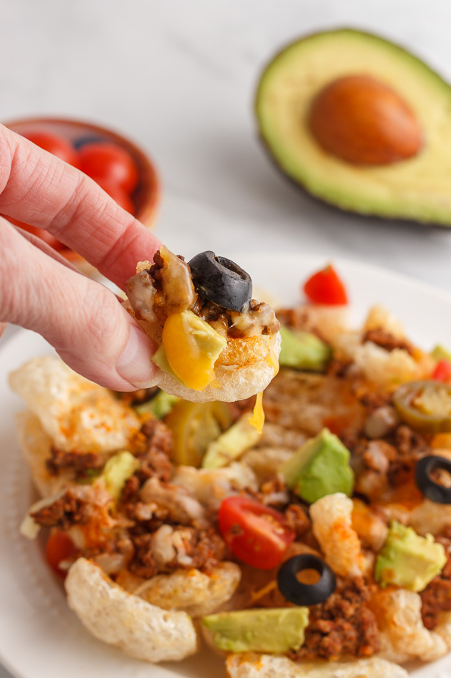Los nachos de taco de res Keach son bajos en carbohidratos, no contienen gluten y tienen todo el sabor de los nachos de res y queso, pero sin los carbohidratos adicionales que vienen con el uso de chips de maíz.