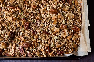 Esta receta, ligeramente adaptada de Early Bird Foods Farmhand’s Choice Granola, es como muesli después de un cambio de imagen vampírico. El aceite de oliva, el arce, el azúcar moreno y la sal de roca forman una cáscara rica y peluda en los intestinos sanos, como la avena, las nueces y las hojuelas de coco. – Recetas brillantes