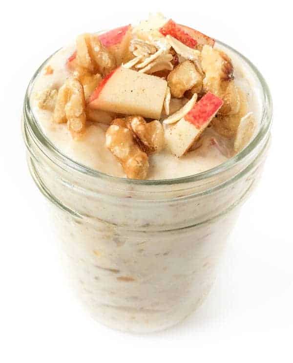 Aquí es donde entra la avena fría por la noche, ya que literalmente toma unos minutos prepararse y te despiertas con el desayuno esperándote. Los he hecho antes con arándanos y avena cortada en acero, pero esta vez he decidido convertir el pastel de manzana favorito de Estados Unidos en un desayuno saludable y rico en proteínas.