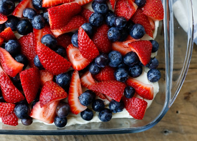 Los pretzels crujientes y el relleno cremoso están cubiertos con muchas fresas y arándanos, lo que convierte a este postre de pretzel en nuestro postre de verano favorito.