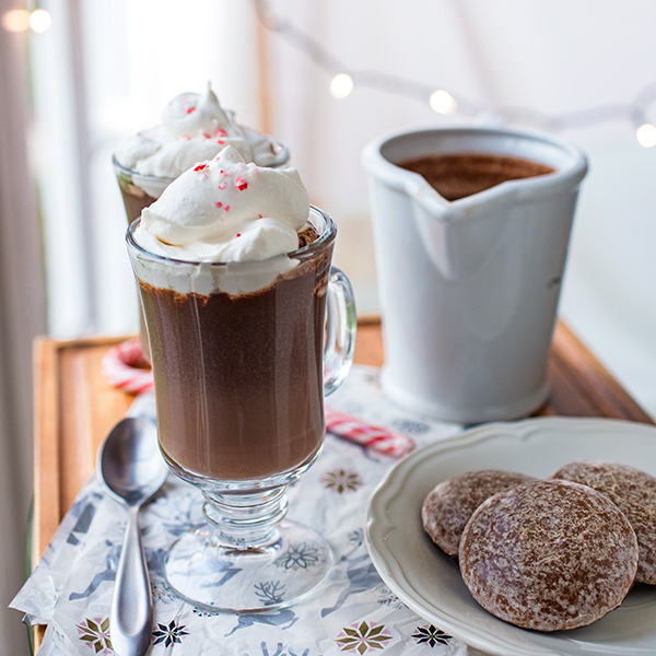 • 4 tazas de leche entera • 1 taza más 2 cucharadas colmadas de hojuelas de chocolate semidulce • ¼ de taza de cacao sin azúcar • 2 cucharadas de azúcar granulada • 1 cucharadita de extracto puro de vainilla • Crema batida rica en menta (receta a continuación) • Bombones de menta, para decorar