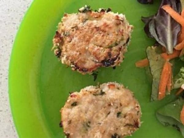Coloque las bolas de pollo recubiertas en la bandeja para hornear forrada y, con la palma de la mano, aplaste la bola ligeramente antes de usar el nudillo del pulgar para sangrar el costado, dándole la forma de un nugget de pollo “normal”. Repita este proceso hasta que se haya utilizado toda la mezcla de pollo.