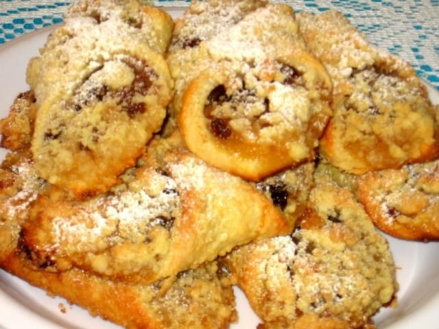 Cortar la masa en cuadrados más pequeños, de aproximadamente 8 cm de tamaño. Agregue manzanas enlatadas en el centro de cada cuadrado y espolvoree con canela y agregue algunas sultanas.