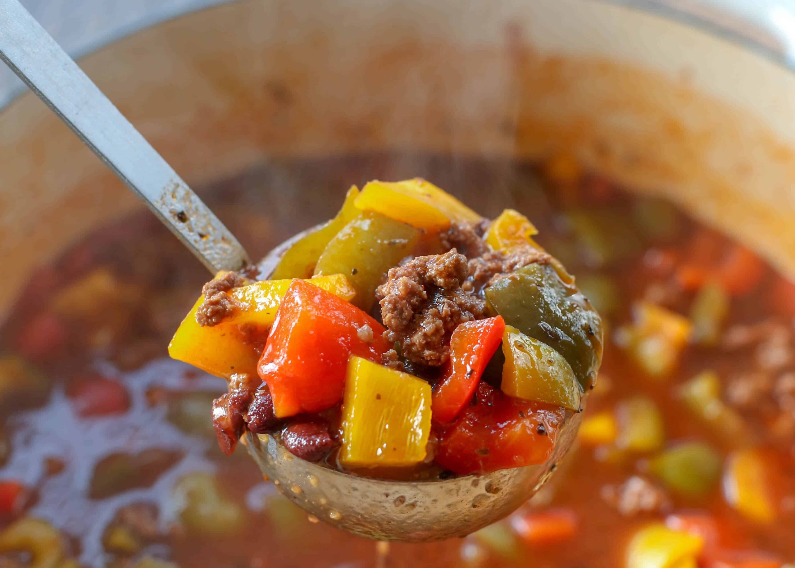 Al igual que esta sopa de pimientos rellenos, Hearty Pepper Chili utiliza muchos chiles frescos, frijoles y especias para ofrecer una comida familiar con sabores del sudoeste aptos para cualquier estación y temporada. White Chicken Chili y Hearty Italian Jack Chili son otras dos recetas de chile que hago una y otra vez.