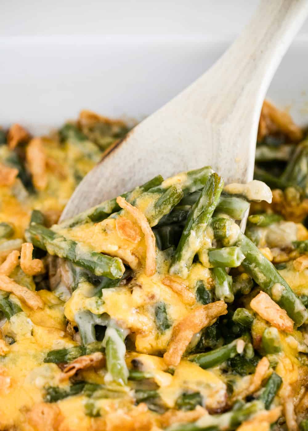 Judías verdes tiernas cubiertas con una salsa cremosa de champiñones, luego cubiertas con queso y cebollas fritas crujientes. ¡Un plato clásico de Acción de Gracias que a todos les encanta!
