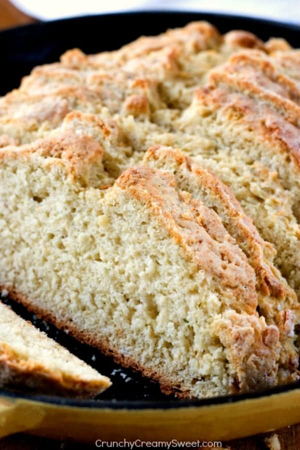 La masa se despeinará después de mezclar. Todo lo que necesita hacer es darle forma de bola, de aproximadamente 8 pulgadas de diámetro (para que quepa en una fuente de 10 pulgadas y todavía tenga espacio para crecer). Puede hacer una x en la parte superior, al igual que el pan de soda irlandés tradicional. Hornea el pan hasta que esté dorado. Si lo retocas, debe ser difícil. Se ablandará a medida que se enfríe. Cepillar la parte superior con la mezcla de queso parmesano y mantequilla derretida es completamente opcional, pero agrega más sabor y riqueza y suaviza la corteza superior.