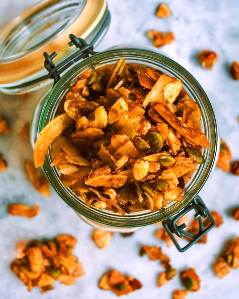 Me encanta espolvorear esta granola en tazones de batido o yogur con fruta fresca. Comer este muesli solo también es muy sabroso.