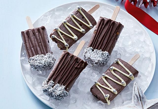 Usando 2 bolsas de tubo, espolvoree cada paleta con chocolate y espolvoree con coco y/o cachet para decorar.