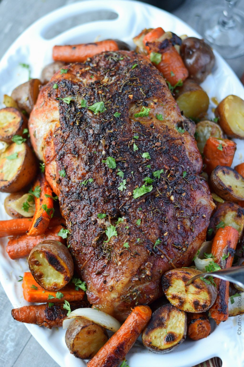Asado lentamente y cocinado a la perfección, tan tierno que ni siquiera necesita un cuchillo. Me sorprendió mucho lo grande que era. Las patatas rojas tienen una cremosidad perfecta y las zanahorias y las cebollas están caramelizadas y dulces. Cocinar hasta que la carne de cerdo alcance unos 185-190 grados asegura que la ternura en la boca se derrita.