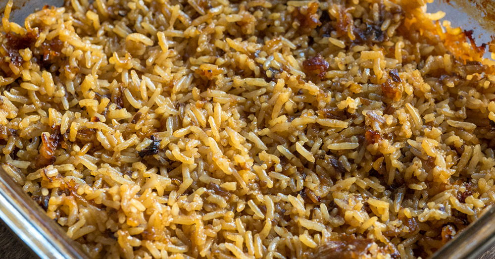 Cocinar arroz en la estufa puede ser un poco estresante ya que nunca estás seguro de cuándo se ha cocinado todo el líquido, pero este método es mucho más indulgente, incluso si el tiempo de cocción es un poco más largo. Todo lo que necesitas hacer es mezclar tres ingredientes: arroz, una lata de sopa de cebolla francesa y una lata de caldo de res, y agregar un trozo de mantequilla en rodajas.