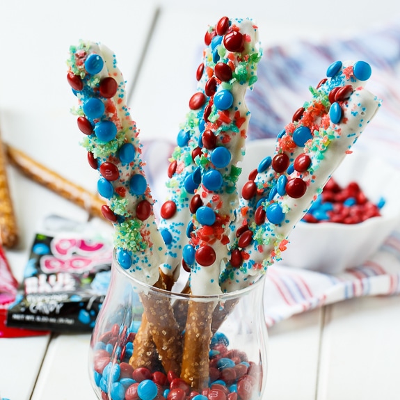 ¡Las barras de pretzel se sumergen en chocolate blanco derretido y luego se decoran con mini M&M’s rojos y azules, chispas y pop rock! A medida que los comes, Pop Rocks hace más mini explosiones en la boca.