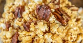 Coloque las palomitas de maíz y algunas nueces en un tazón gigante. Luego prepara la mezcla de caramelo. Combinará el jarabe de maíz, la mantequilla y el azúcar moreno en una olla grande. Lleve la mezcla a ebullición y retire del fuego. Agregue un poco de vainilla y bicarbonato de sodio. Vierta la mezcla de caramelo sobre las palomitas de maíz y las nueces. Revuelva para cubrir todo. Vierta las palomitas de maíz cubiertas en una olla grande y hornee durante una hora. Finalmente, extienda las palomitas de maíz sobre papel pergamino o papel pergamino y déjelo enfriar.