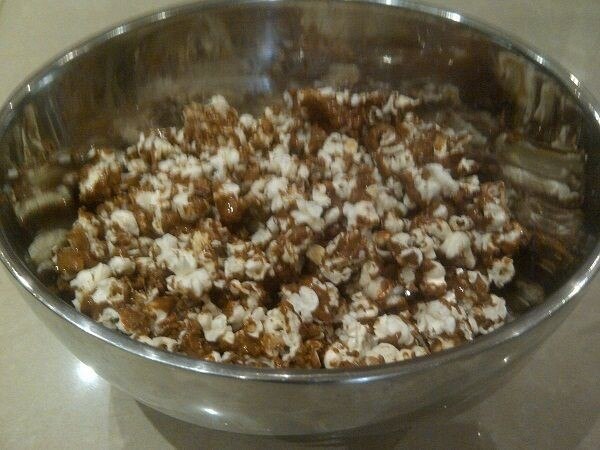 Poco a poco agregue las palomitas de maíz, asegurándose de que estén cubiertas de caramelo.