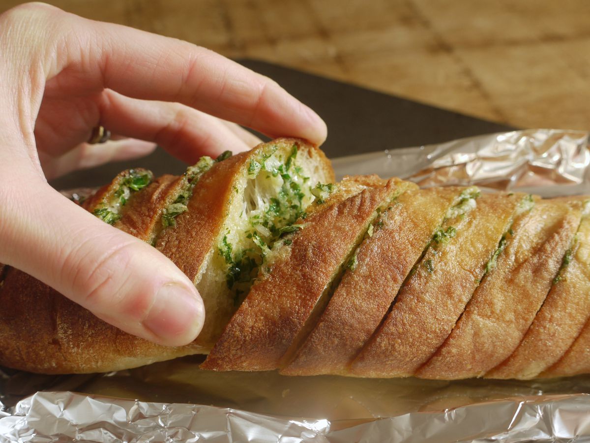 Con un centro masticable, una corteza marrón crujiente y charcos de mantequilla salpicada de perejil, las baguettes caseras de pan de ajo están a un mundo de distancia de los bollos de aspecto anémico en el pasillo de congelados de su supermercado local. —Kate Doran