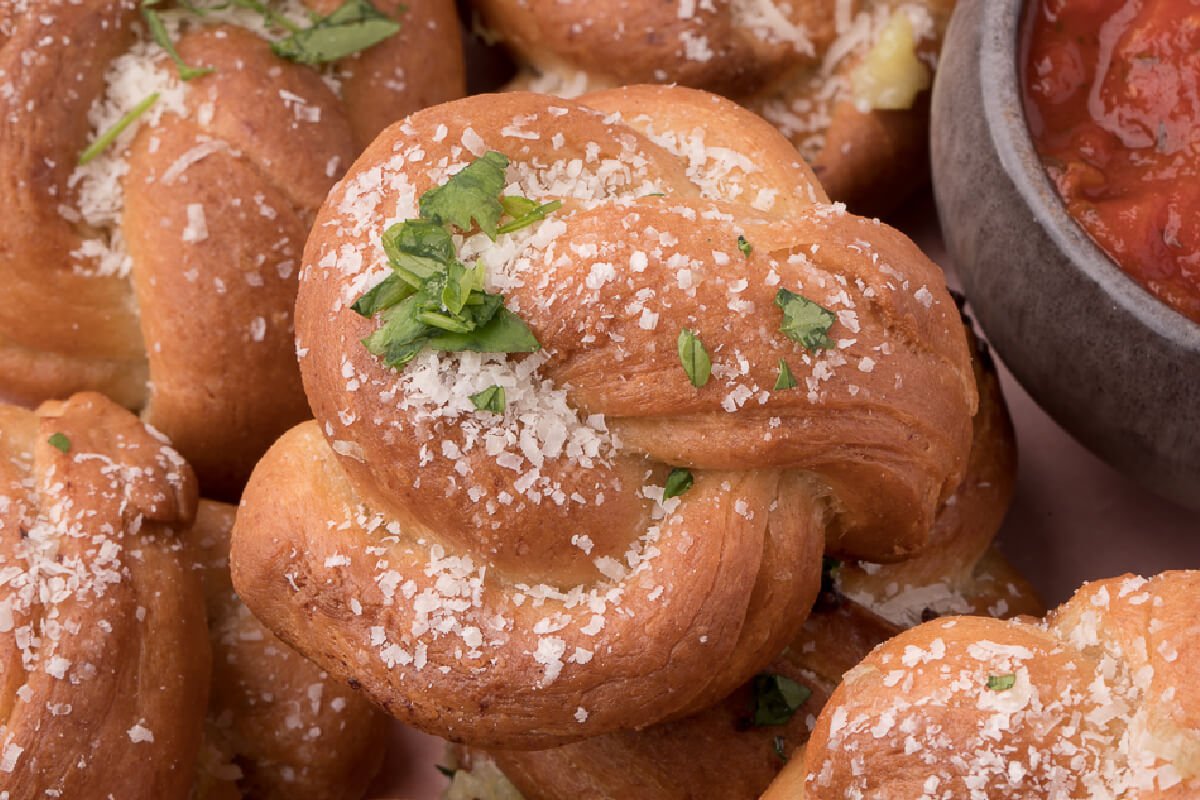 ¡Una receta simple de nudos de ajo te brinda un sabroso y sabroso aperitivo casero! Incluye recetas de salsa de tomate y mantequilla de ajo.