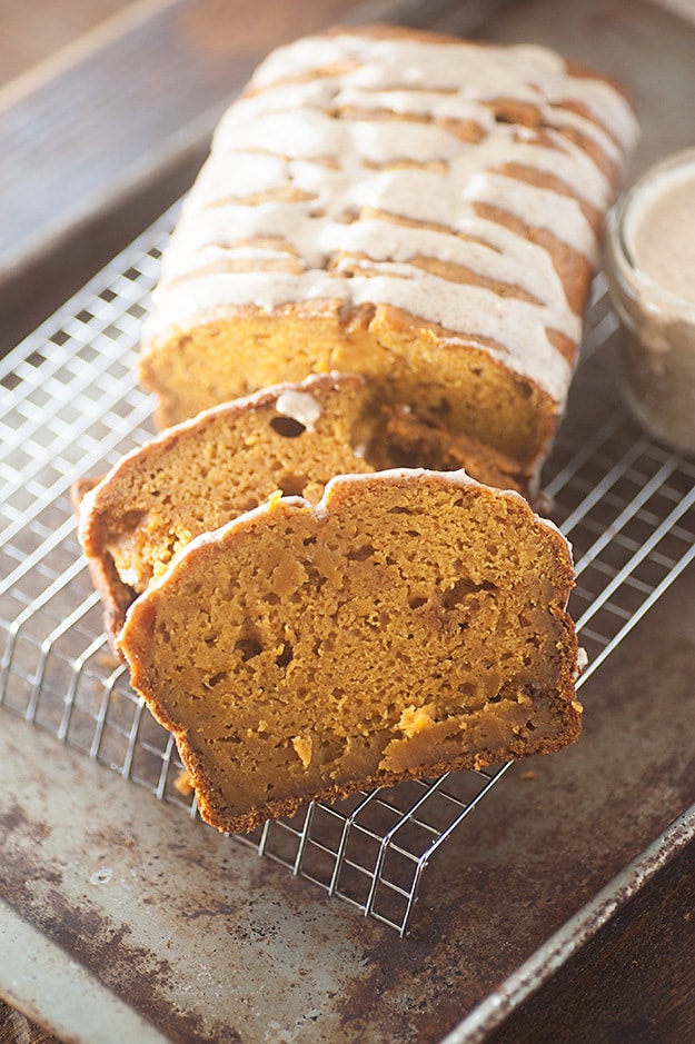 Esta receta de pan de calabaza está rellena con la mayor cantidad posible de calabaza, lo que la hace increíblemente húmeda, espesa y fangosa. ¡Es casi como morder un trozo de caramelo! ¡El glaseado de mantequilla dorada en la parte superior hace que las cosas sean aún más increíbles!