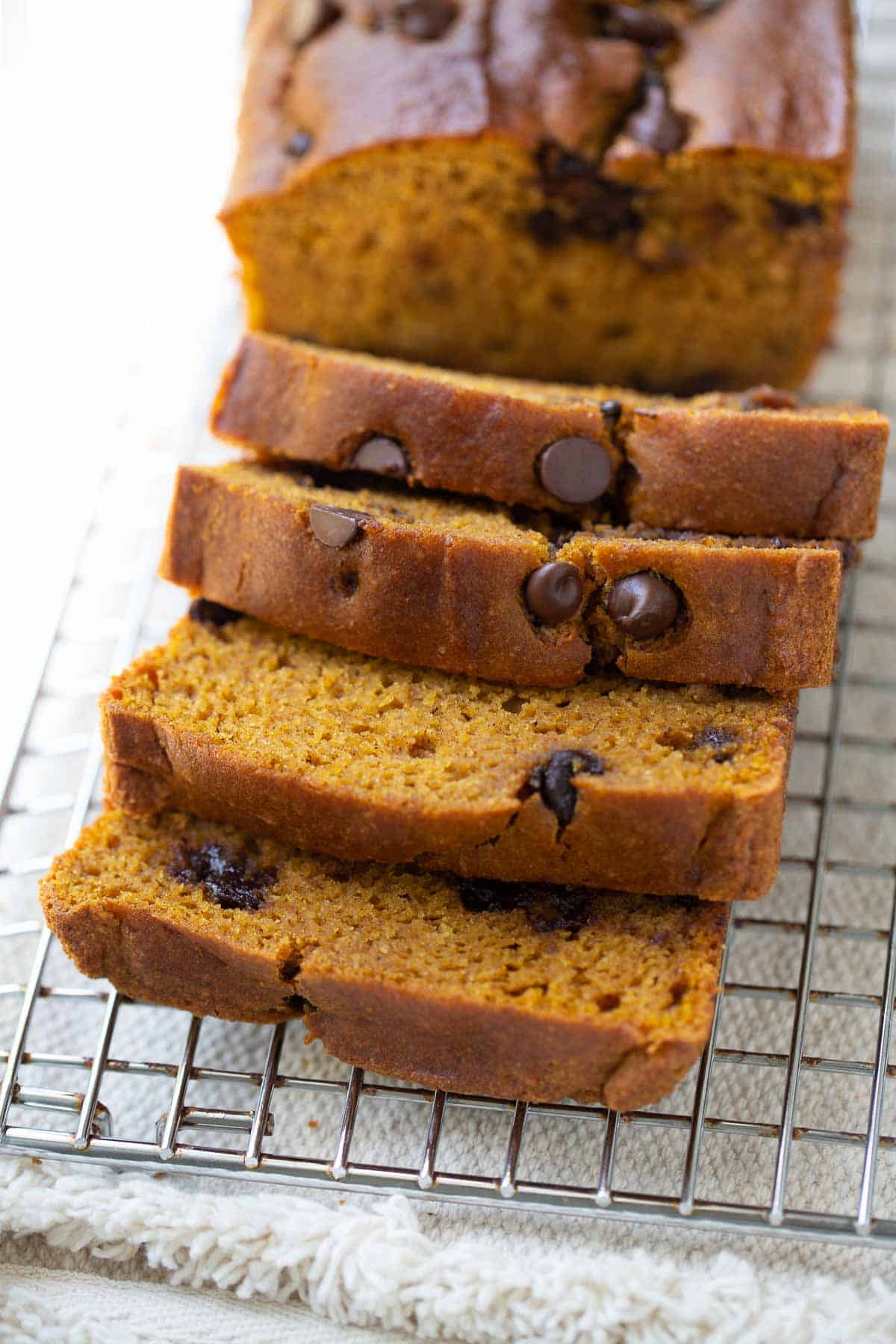 Cuando llega septiembre, ¡este molde de calabaza y chocolate sin gluten es mi favorito! Cada rebanada está perfectamente húmeda y sazonada con canela. La textura es perfecta (aquí no hay bollos que se desmoronen) y cada bocado tiene muchas chispas de chocolate. ¡No sería una caída sin él!