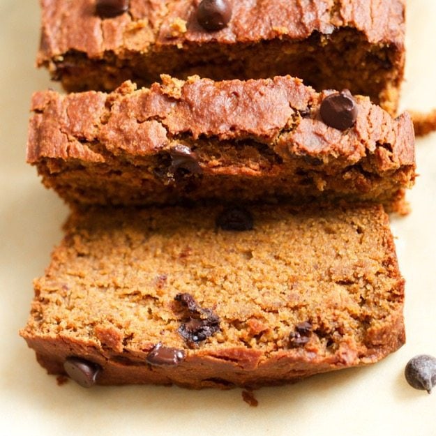 Una vez enfriado, este pan está húmedo y esponjoso de calabaza enlatada y lleno de aroma y sabor a especias de calabaza. Esto es todo lo que debería ser un sándwich de calabaza rápido, pero un poco más saludable.
