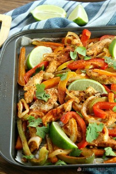 Ordenaba fajitas de pollo todo el tiempo cuando comíamos fuera y pensaba que podía hacer este plato en casa con la misma facilidad. El uso de una bandeja de papel hace que esto sea rápido y fácil. ¡Y hay una limpieza mínima! Esto es siempre una victoria en mi libro. Es perfecto para una comida rápida entre semana porque puedo hacer otra cosa mientras cocino. Puedes hacer este plato aún más rápido si preparas las verduras con anticipación.