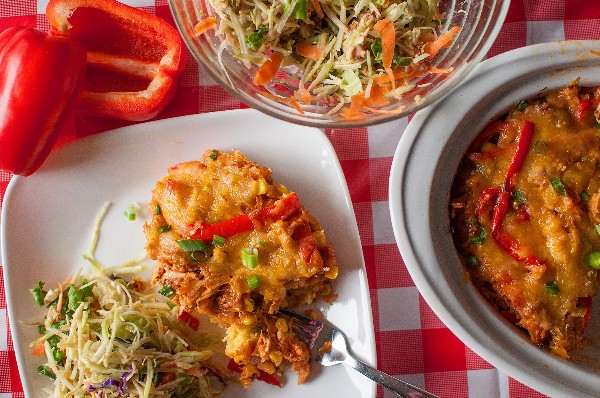 Prepare y hornee pan de maíz en un molde según las instrucciones del paquete. Mientras se cocina el pan de maíz, saltee los pimientos y la cebolla a fuego medio-alto durante unos 5 minutos, o hasta que estén cocidos a su gusto. Reduzca el fuego a bajo y agregue el pollo asado y el maíz. Revolviendo hasta que esté completamente caliente. Mi pollo estaba bastante picante, pero si quieres agregar más salsa barbacoa, ¡ahora es el momento! Vierta la mezcla de pollo sobre el pan de maíz cocido. Cubra con queso y cocine a la parrilla durante unos minutos hasta que el queso se derrita y hierva. Cubra con cebollas verdes, si lo desea. ¡Atender!