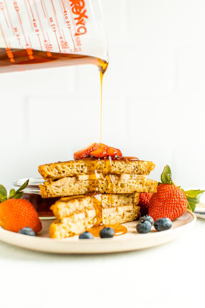 Somos grandes fanáticos de las tostadas francesas en nuestra casa. Me encanta lo fácil que es mi tostada francesa durante la noche, pero cuando quiero tostadas más saludables también es súper fácil, ¡me encanta hacer esta tostada francesa rellena! Las tostadas francesas rellenas tradicionales (ejem, tostadas francesas rellenas IHOP) pueden tener hasta 1450 calorías por porción… ¡1450! Esta versión es mucho más saludable y tiene menos de 200 calorías por porción. Es bajo en azúcar y alto en grasas saludables y proteínas. ¡Nada mal!