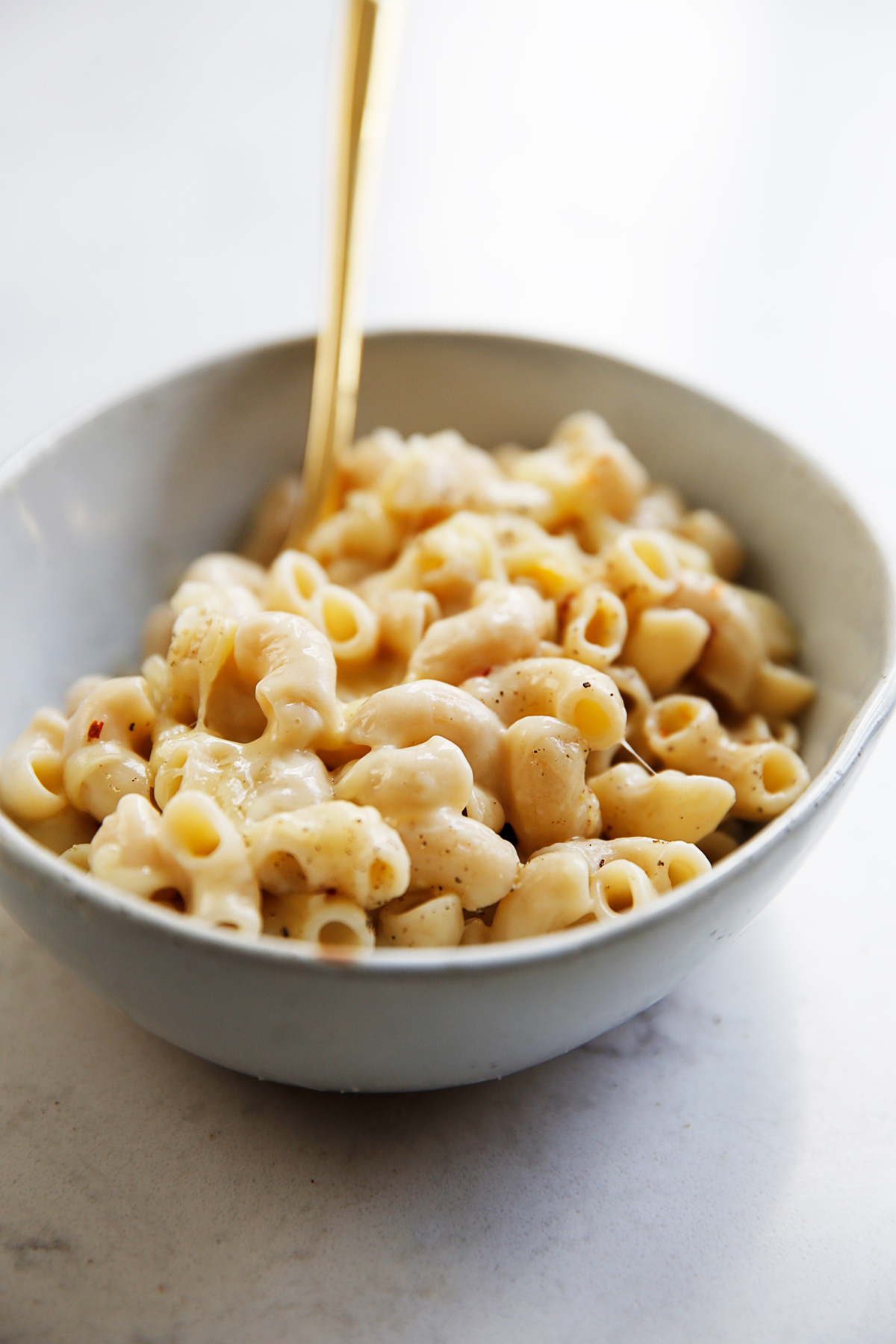 Si bien es mucho más fácil comprar quesos previamente rallados, querrá dar un paso adicional y rallar su propio queso monobloque para esta receta. Las recetas caseras de macarrones con queso a menudo se basan en un roux para mayor cremosidad, pero esta receta se salta ese paso. En su lugar, confiamos en el almidón del agua de los macarrones Y en la capacidad del queso para integrarse por completo en los macarrones con queso. El queso previamente rallado tiene otros ingredientes adicionales para evitar que el queso se pegue a la bolsa, pero estos ingredientes adicionales pueden evitar que el queso se derrita por completo.