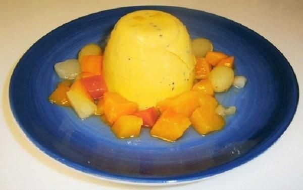 Agregue la crema de coco y la leche de soya a una sartén y caliente. Agregue maracuyá y jugo de limón. Mezclar con una batidora de mano hasta que quede suave. Agregue las especias, el almíbar y el azúcar. Llevar a ebullición suave y añadir el agar-agar.