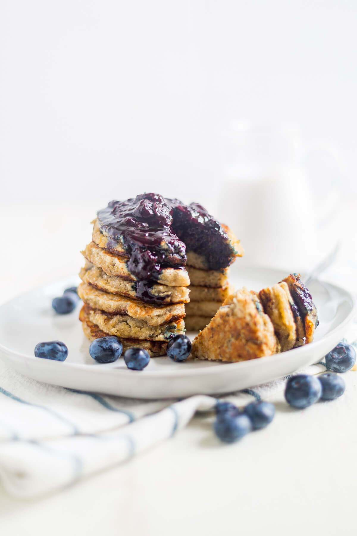 ¡Los arándanos se cocinan y espesan en un jarabe saludable para complementar los panqueques de harina de coco!
