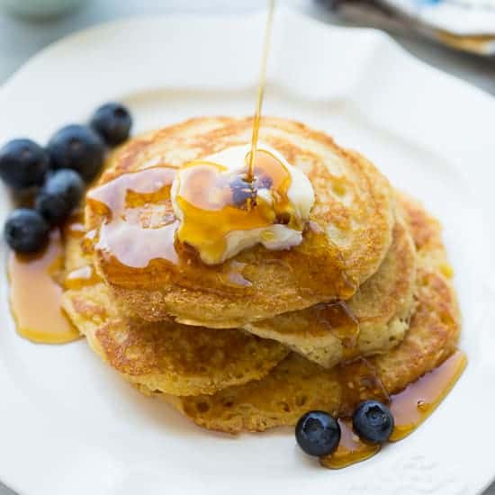 Cuando tengo ganas de cambiarlo, estos panqueques de crema agria de harina de maíz se han convertido en mi opción. Mi papá hizo panqueques de maíz con crema (pero no sin gluten) para casi todas las vacaciones mientras crecía. Incluso los tendríamos en la mañana de Navidad en los años venideros. ¡Ahora me encanta hacer esta versión sin gluten para ocasiones especiales!