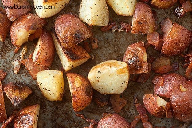 - Vierta las papas en la bandeja para hornear preparada en una sola capa. Hornear durante 35 minutos y retirar del horno.