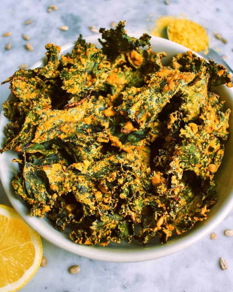 Si está buscando papas fritas súper crujientes, sabrosas y adictivas, ¡no busque más! Estos chips de col rizada están cubiertos con una mezcla de semillas de girasol tahini para una solución de grasa crujiente y saludable. Las especias y la levadura nutricional agregan un sabor casi “cursi”, y el jugo de limón agrega un sabor agradable.