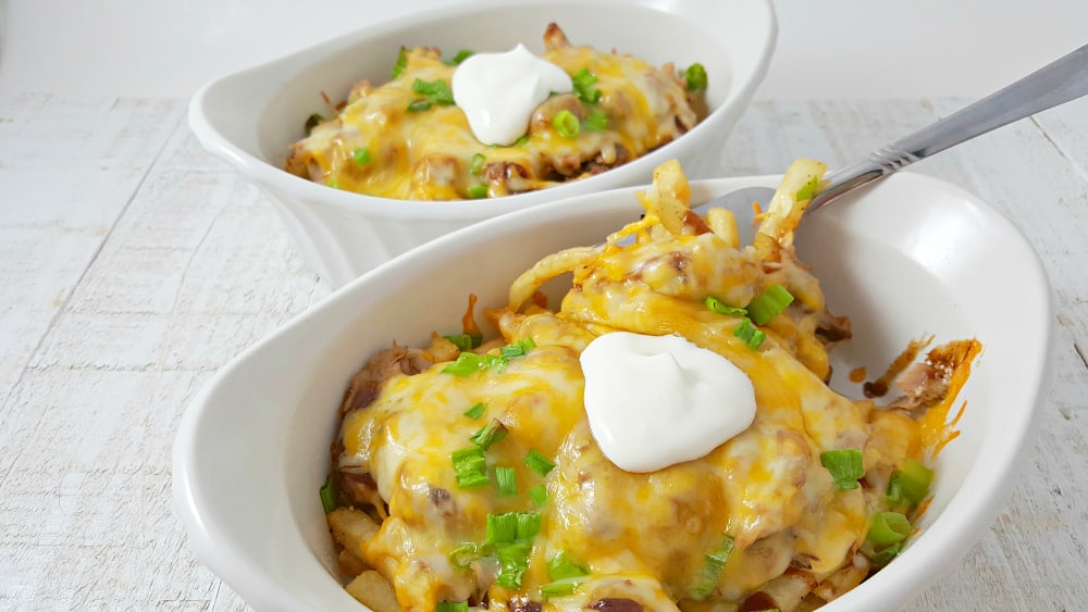 ¡Esta parrillada de papas fritas de cerdo es segura! Las papas fritas crujientes o al horno se cubren con cerdo ahumado, salsa barbacoa, queso rallado, crema agria y cebollino.