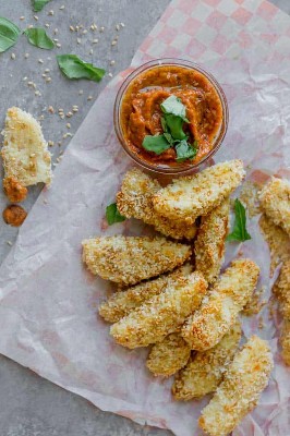 ¡Esta es mi versión libanesa de palitos de mozzarella, con queso halloumi! Estos chips de halloumi se preparan enrollando queso en harina, pan rallado y semillas de sésamo, luego se hornean hasta que estén dorados y crujientes. Los combiné con una salsa marinara simple y brillante para mojar, ¡un divertido refrigerio mediterráneo!